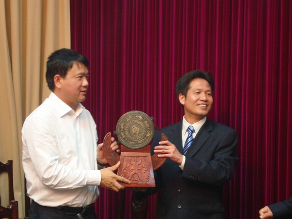 集團(tuán)公司董事長(zhǎng)朱堅(jiān)和(上圖右)與越南交通運(yùn)輸部部長(zhǎng)丁羅升先生交換禮物。