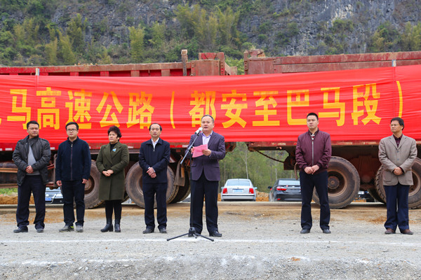 集團(tuán)公司副董事長(zhǎng)、總經(jīng)理、黨委副書記唐咸秋在會(huì)上發(fā)表講話,他表示本項(xiàng)目的建設(shè),將極大改善我區(qū)尤其是河池等地的交通狀況和投資環(huán)境,為確保我區(qū)打贏脫貧攻堅(jiān)戰(zhàn)的勝利,具有十分重要的意義。他表態(tài)集團(tuán)公司將充分發(fā)揮人才優(yōu)勢(shì)、技術(shù)優(yōu)勢(shì)和全產(chǎn)業(yè)鏈優(yōu)勢(shì),安全、優(yōu)質(zhì)、高效、廉潔地建好項(xiàng)目,為營(yíng)造“三大生態(tài)”、實(shí)現(xiàn)“兩個(gè)建成”、譜寫建黨百年廣西發(fā)展新篇章作出新的更大的貢獻(xiàn)。河池市黃光華書記表示,賀巴高速是脫貧致富之路、是共建共贏之路、是圓夢(mèng)小康之路,他要求河池市各級(jí)黨委、政府要高度重視,沿線群眾要積極配合高速公路的建設(shè)。