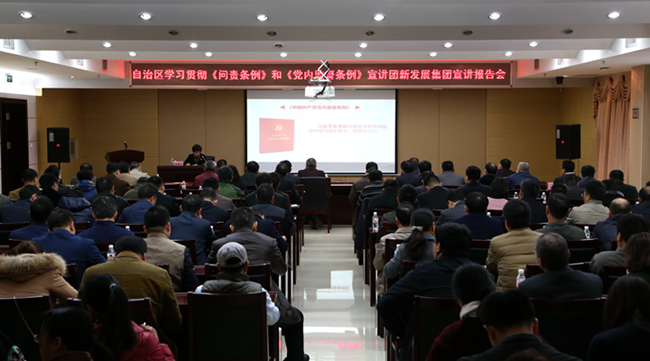 2017年2月24日上午,自治區(qū)學習貫徹《中國共產黨問責條例》《中國共產黨黨內監(jiān)督條例》宣講團到集團公司舉行宣講報告會,自治區(qū)紀委宣傳部部長陳柳青作宣講報告,集團公司黨委副書記、副董事長、總經理唐咸秋主持會議。