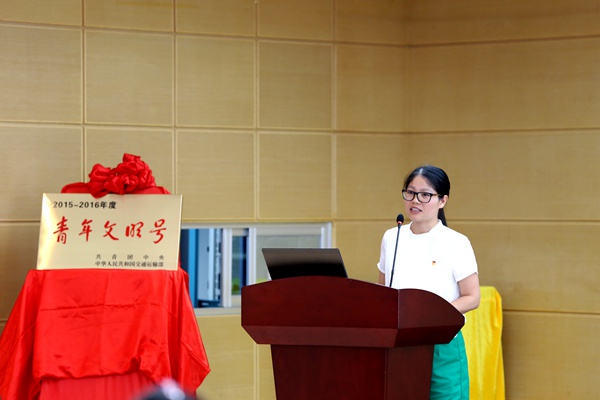 隨后,交通運(yùn)輸廳團(tuán)委阮夏恒書記宣讀共青團(tuán)中央聯(lián)合其他21個部委下文的《關(guān)于命名2015—2016年度全國“青年文明號”的決定》。宣讀完畢后,團(tuán)區(qū)委青年發(fā)展部部長助理張弛、交通廳團(tuán)委書記阮夏恒、集團(tuán)公司黨委副書記張友坐、設(shè)計院公司黨委書記周錚共同為“青年文明號”揭牌。