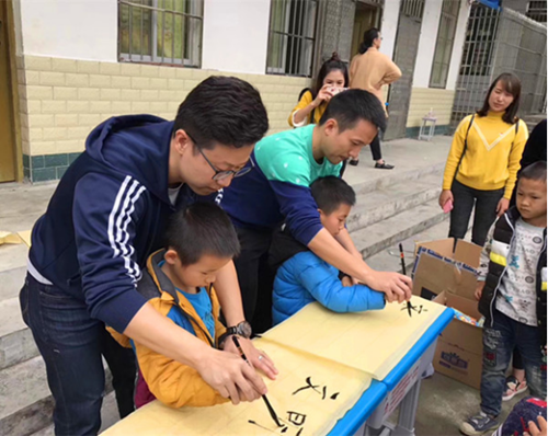 集團(tuán)公司青年團(tuán)干在游園活動(dòng)中教學(xué)生寫(xiě)毛筆字