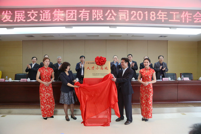 會后,自治區(qū)國資委副巡視員鞏學(xué)青與集團公司黨委書記、董事長朱堅和一同為集團公司“廣西交通建設(shè)人才小高地”揭牌。