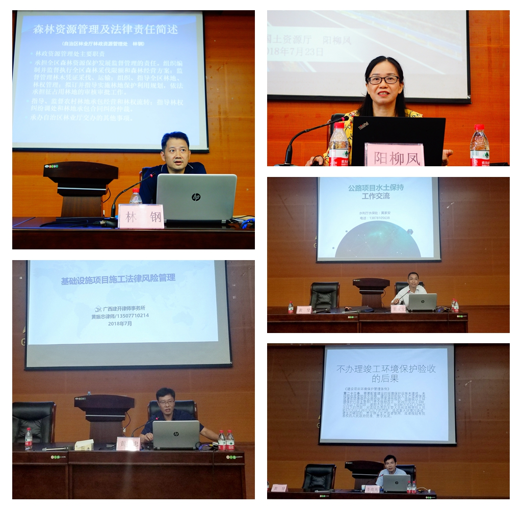 此次培訓(xùn)邀請(qǐng)了自治區(qū)國(guó)土資源廳規(guī)劃處副處長(zhǎng)陽(yáng)柳鳳、林業(yè)廳林政處副處長(zhǎng)林鋼、環(huán)境保護(hù)廳環(huán)評(píng)處處長(zhǎng)李亮光、水利廳水土保持處副處長(zhǎng)黃家安以及廣西建開律師事務(wù)所主任黃振忠律師5位專家圍繞項(xiàng)目建設(shè)過(guò)程中的國(guó)土、林地、環(huán)境保護(hù)、水土保持以及項(xiàng)目經(jīng)營(yíng)常見法律政策問(wèn)題進(jìn)行專題授課。此次培訓(xùn)緊貼建設(shè)項(xiàng)目管理的實(shí)際需求,內(nèi)容豐富,針對(duì)性強(qiáng)。通過(guò)培訓(xùn),提高了廣大建設(shè)項(xiàng)目管理人員的法律政策水平,增強(qiáng)了處理具體法律問(wèn)題的能力,對(duì)今后依法依規(guī)建設(shè)項(xiàng)目起到很好的促進(jìn)作用。