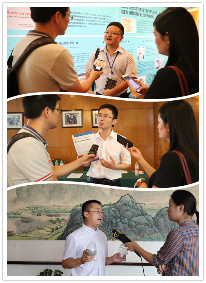 圖為廣西交科院熊劍平博士(上)、張洪剛博士(中)、周勝波博士(下)接受媒體采訪介紹會議情況和公司最新產品研發(fā)成果